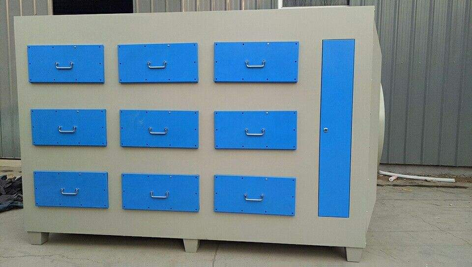 当废气由风机提供动力,负压进入环保箱后进入活性炭吸附层,由于活性炭吸附剂表面上存在着未平衡和未饱和的分子引力或化学键力,因此当活性炭吸附剂的表面与气体接触时,就能吸引气体分子,使其浓聚并保持在活性炭表面,此现象称为吸附。利用活性炭吸附剂表面的吸附能力,使废气与大表面的多孔性活性炭吸附剂相接触,废气中的污染物被吸附在活性炭表面上,使其与气体混合物分离,净化后的气体高空排放。活性炭环保箱是一种干式废气处理设备,由箱体和填装在箱体内的吸附单元组成。